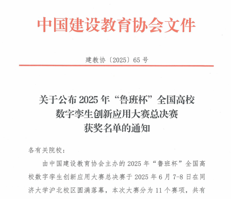 本站讯  6月7日至8日,由中国建设教育协会主办的2025年“鲁班杯”全国高校数字孪生创新应用大赛总决赛在同济大学沪北校区圆满收官。经过激烈角逐,bat365在线官方网站学子凭借扎实的专业技能与创新应用能力脱颖而出,一举斩获两项三等奖。