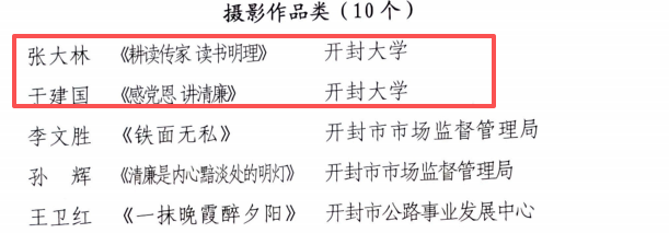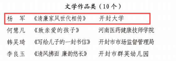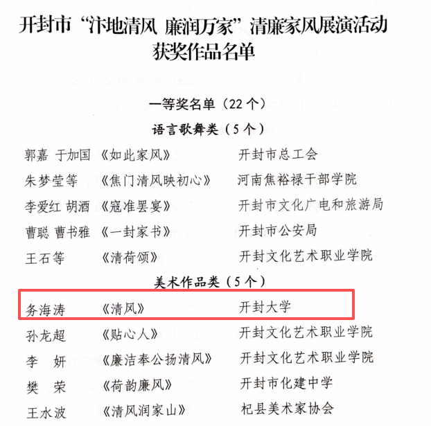 本站讯  近日,由开封市纪委监委机关、市妇联、市教体局联合举办的“汴地清风 廉润万家”家风巡演活动圆满落幕。我校凭借扎实的文化艺术功底和对清廉家风的深刻诠释,在众多参赛作品中脱颖而出,斩获多个奖项,充分展现了开大人崇廉尚廉的精神风貌与良好综合素养。
