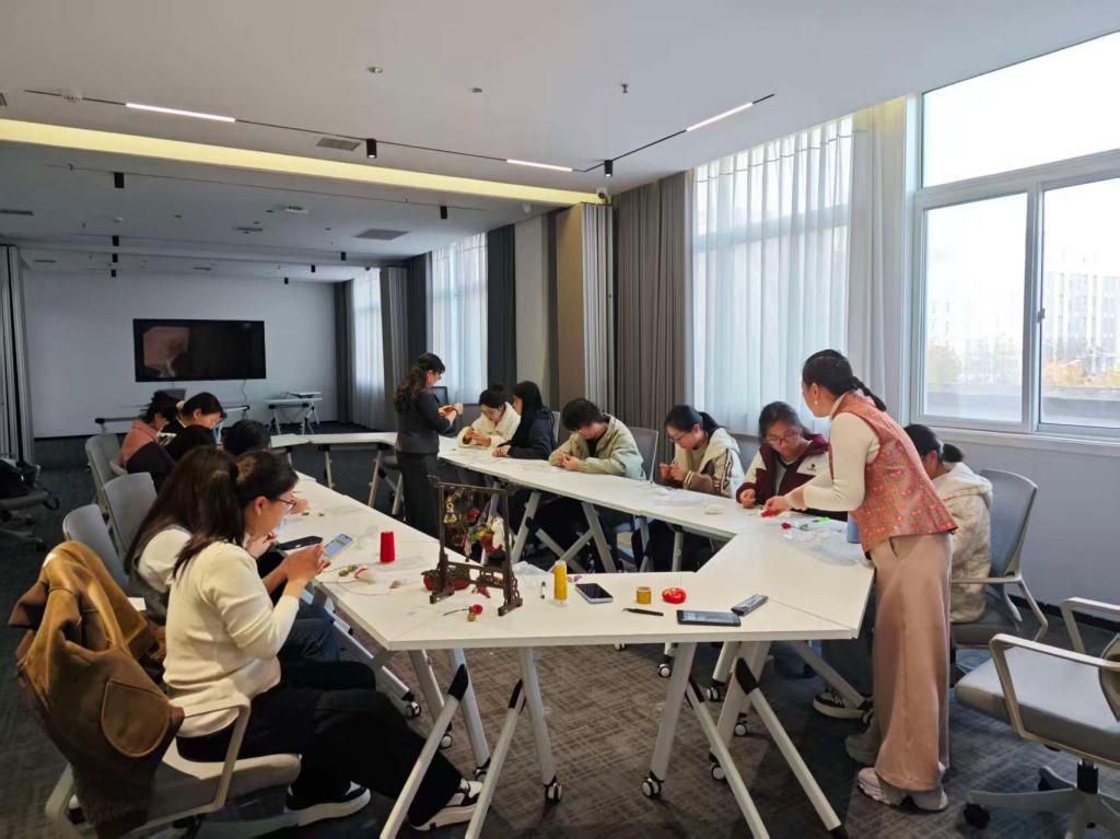 本次活动由信息工程学院(软件职业技术学院)与国际教育学院(外国语学院)联合承办。信息工程学院展区聚焦 AI 技术与非遗文化融合,张新成教授以《从 “会用” 到 “用好”——AI 助手重塑大学生活》为题开展专题讲座,Deepseek 大赛获奖团队展示 AI 大模型与 C 语言创新成果;非遗板块中,非遗传承人佟燕华讲解古籍修复技艺,刘秋红、宋长虹则现场指导香囊、双头鹦风筝制作。同时,学院开展“心”随E动“语”愈心灵心理团建活动,通过珠行万里、集体长跳绳等系列环节,帮助学生释放压力、凝聚团队向心力。国际教育学院展区举办第八届商品营销大赛,108 支队伍的600 余名学子将《管理学基础》课程知识应用于商业实践,提升综合能力。