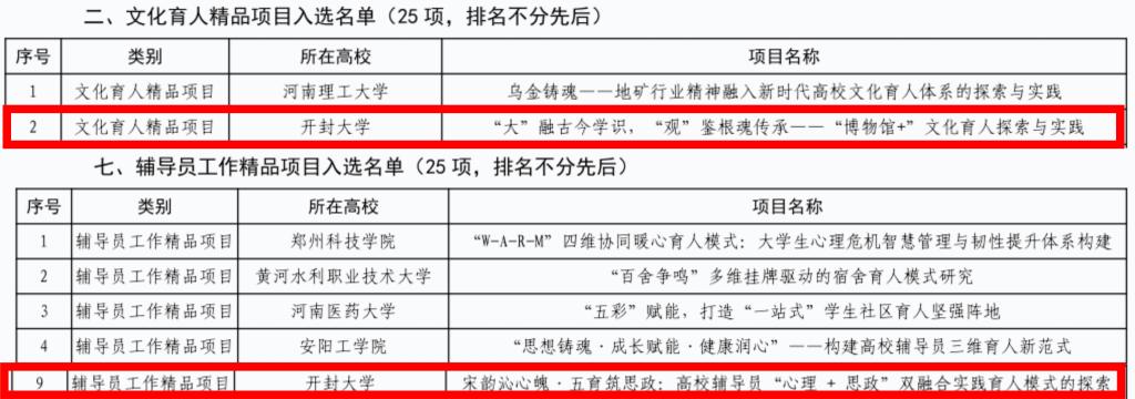 本站讯  近日,中共河南省委教育工委办公室、河南省教育厅办公室联合印发《关于公布2025年河南省高校思想政治工作质量提升综合改革与精品建设项目入选名单的通知》(豫教工委办〔2025〕35号)。我校申报的《“大”融古今学识,“观”鉴根魂传承——“博物馆+”文化育人探索与实践》与《宋韵沁心魄•五育筑思政:高校辅导员"心理+思政"双融合实践育人模式的探索》分别入选文化育人精品项目和辅导员工作精品项目,充分彰显了学校在思想政治工作领域的创新实践与显著成效。