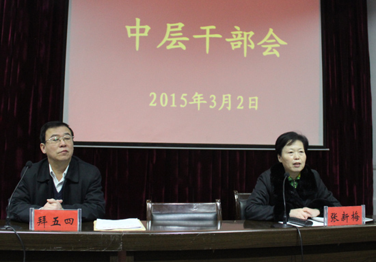 本站讯 3月2日上午,我校在国际教育学院一楼会议厅召开新学期中层干部会,布置新学期工作,进行升本工作动员。校领导、中层干部参加会议。会议由校党委书记张新梅主持。