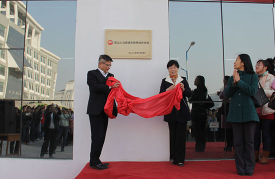 昆山人力资源市场集团公司副总经理柯金林和我校党委书记张新梅为昆山人力资源市场开封分市场揭牌。