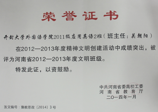 本站讯:据中共河南省委高校工委、河南省教育厅《关于表彰2012—2013年度精神文明建设先进集体和先进个人的决定》(豫教思政〔2014〕3号),我校精神文明创建工作荣获两项省级荣誉,外国语学院2011级应用英语2班被评为2012—2013年度文明班级,财政经济学院张伟伟同学被评为2012—1013年度文明学生。