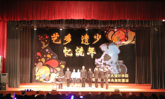 6月5日晚7时,艺术设计学院在金松大礼堂举办了 “艺多 遗少 忆流年”欢送毕业生晚会。整场晚会以毕业生三年的学习生活经历为背景,以话剧形式编排整场晚会,将丰富多彩的节目穿插其中,衔接紧密:军训期间的《黄河大合唱》;纳新期间的拉丁舞、街舞表演;上服装史课时的梦境《刺秦》;为了想多睡一会而耽误元旦晚会节目排练的《三人小品》等,每个节目都赢得了全场师生的热烈掌声。晚会以给《毕业生的一封信》结束,学弟学妹们为毕业生们送去了最美好的祝福。