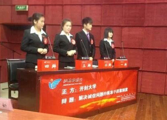 参加本次比赛得到校学生处,学生资助中心,学院领导高度重视,学校通过精心选拔及赛前的集中训练,最终选派由外国语学院12级商务英语1班梁迪、商务英语3班徐长秀、13级应用日语班闫浩、简旭容、13级应用英语班陈苗清、13级商务英语3班孙磊6名选手组成的代表队参加比赛,由王笑禹老师担任指导老师。本次大赛以“选择诚信、崇尚诚信、坚守诚信”为主题,参赛代表队分别围绕“解决诚信问题的根本手段靠制度;解决诚信问题的根本手段靠道德”、“当今时代,应当提倡干一行爱一行;当今时代,应当提倡爱一行干一行”、“诚信主要由社会因素决定;诚信主要由个人因素决定”三个辩题展开了激烈辩论。我校代表队经过两天的激烈角逐,最终以优异战绩荣获二等奖。