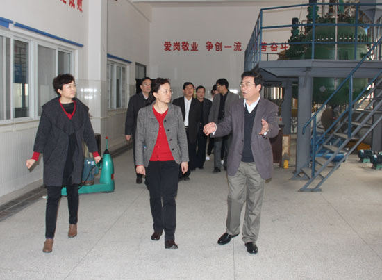 开封市副市长孙晓红(前中)在校领导陪同下参观中试生产车间