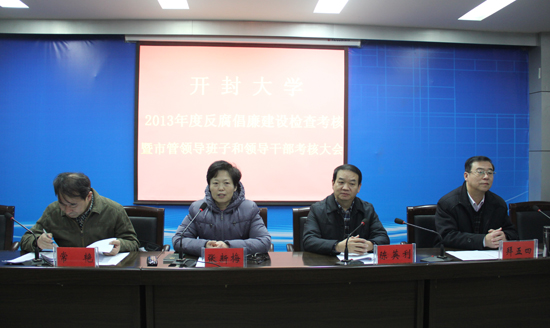 本站讯 12月26日上午,以市委组织部副部长陈英利为组长、市纪委廉自办主任常艳为副组长的市委考核组一行7人对我校党政领导班子及市管领导干部进行2013年度考核。校党委书记张新梅、校长拜五四,全体校级领导及中层正职干部、各民主党派负责人、正高职称人员参加了会议,会议由党委书记张新梅主持。