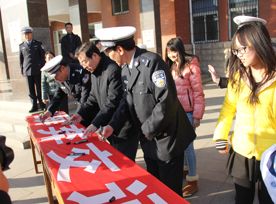 随后,开封市公安交警支队交警与我校师生共同在“摒弃交通陋习 安全文明出行”横幅上签字,并观看了交通安全宣传展板。