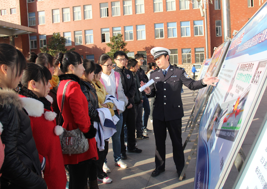 本站讯 12月2日是 “全国交通安全日”,11月28日下午,我校联合开封市公安交警支队在晋安路校区明德广场开展“摒弃交通陋习,安全文明出行”的全国交通安全日教育宣传活动。省交警总队副总队长姚占军、市交警支队支队长徐桢、市交警支队副支队长邓宏伟,我校校长拜五四、副校长万是明出席活动。学生处、团委、保卫处相关负责人,30余名交警及我校2000余名学生参加了此次活动。