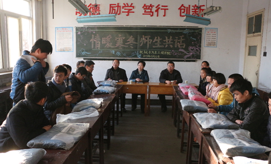 12月12日下午,学校领导张新梅、万是明、耿广利、成芳深入学院和学生宿舍,亲手把代表学校关爱的御寒棉衣送到家庭经济困难学生手中。校领导与同学们亲切交谈,详细询问了同学们的学习生活情况,转达了学校对同学们的关心和关爱,并鼓励同学们在学习和生活中端正心态、明确目标、学会感恩、拼搏奋进,做一个品德良好、体魄健康和仪表高雅的人,为今后的人生道路打下坚实的基础。