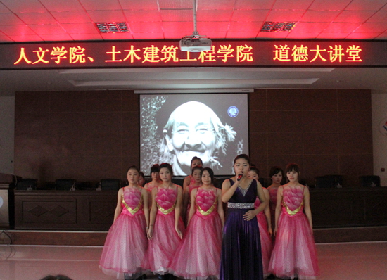 此次大讲堂分为思母、追梦、爱国三个篇章,通过视频和情景表演诠释了中华传统道德中的仁、义、礼、智、信。开场以感人的母子离别的场面打动观众,在《天之大》的歌声中感受母爱的无私与博大;铿锵有力的诗歌朗诵《我是中国人》、《中国梦》展现了人文、土木学子立志成才、回报社会、报效祖国的坚定信心;学生合诵的《仁、义、礼、智、信》则展现了中华传统美德在今天所焕发的时代光芒;活动在大合唱《我的祖国》雄壮歌声中落下帷幕。