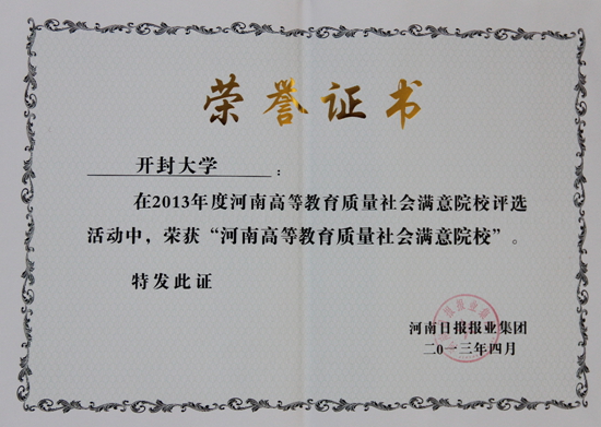 本站讯 近日,由河南日报报业集团举办的“2013河南高等教育质量社会满意院校”调查评选活动结果揭晓,我校荣获“河南高等教育质量社会满意院校”荣誉称号。