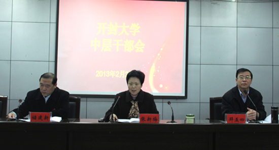 拜校长指出,今年全年工作要以十八大精神和科学发展观为指导,以教学为中心,以改革创新为动力,以科学管理为保障,以谋大事、干大事、成大事的胆略与气魄,全力推进两大攻坚战,实施五大工程,深化五项改革,为实现升本的总体战略目标,为把开大办成国内知名、特色鲜明、水平一流的高等院校而努力奋斗!为实现升本战略目标,要一切围绕升本,一切服从升本,一切为了升本,圆好开大人的升本之梦;要继续保持攻坚的姿态,全力推进创造升本条件的攻坚战和新校区建设的攻坚战;实施好人才工程、质量工程、民心工程、校企合作工程、数字化校园工程五大工程;深化人才培养模式改革、管理思想机制改革、绩效工资改革、考核办法改革、资产管理改革等五项改革。