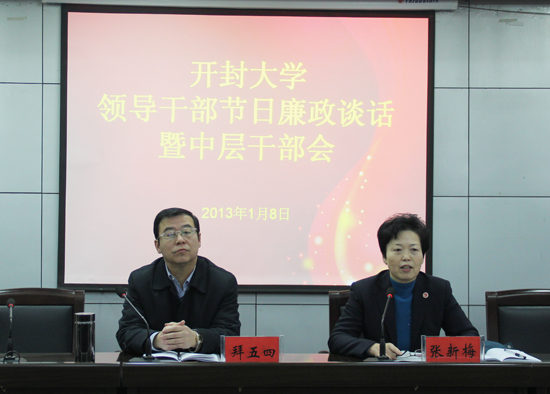 会上,党委书记张新梅首先传达了中共开封市委十届五次全体(扩大)会议、市委经济工作会暨市政府全会会议精神,要求各单位、各部门认真学习领会省市经济工作会议精神,并结合实际工作,切实推动学校各项工作的开展。在对领导干部进行廉政谈话中,张书记希望每一位领导干部要增强忧患意识、危机意识,保护学校声誉和形象,并提出五点要求。要认清反腐倡廉形势,保持警钟常鸣;要认清腐败行为的严重危害,做到防微杜渐;要牢记廉政风险,要时刻不忘摆正心态,做到自我净化;要承担勤廉责任,增强履职能力。最后,张书记感谢大家为学校的发展付出的辛勤劳动,并希望大家能够自重、自省、自警、自励,提高廉洁从业意识,清廉过节,为家庭和睦、校园和谐做出新的成绩。