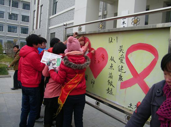 活动现场,十余块宣传艾滋病传播途径和预防知识的版面一字排开,受到了同学们广泛观注,许多同学都驻足停留,认真详细地阅读宣传册,并在携手抵制艾滋条幅签上了自己的名字。从活动现场过往的同学争先恐后地将纸制的“红丝带”粘贴在艾滋病宣传的板报上。一时间,形成了一个由“红丝带”围成的鲜活跳跃的爱心。相信同学们在粘贴“红丝带”的同时,已经肩负起了宣传艾滋病预防治知识的责任。