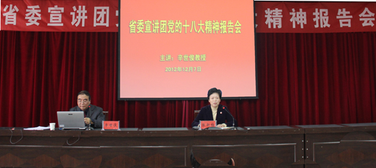 本站讯 12月7日上午,省委宣讲团党的十八大精神报告会在我校国教楼五楼会议厅举行。省委宣讲团成员郑州大学学报主编辛世俊教授为我校师生作了深刻而又生动的宣讲,全体校领导、党员干部代表及学生骨干代表300余人参加了本场报告会。报告会由校党委书记张新梅主持。