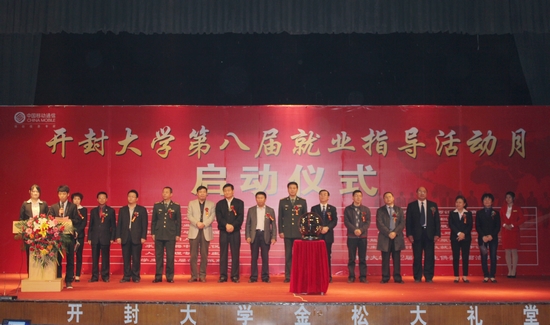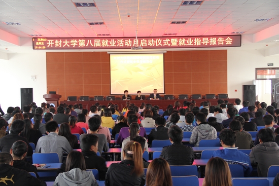 本站讯 10月26日下午,我校在晋安路校区金松大礼堂举行第八届就业指导活动月启动仪式。河南省教育厅就业服务中心市场信息部主任马旭辉,开封军分区副司令员兼参谋长张中华,开封市人力资源和社会保障局副局长程崇正,开封市教育局党委书记常跃进,开封市教育局局长郑西乾,开封市人才交流中心主任姜慧勇,金明区武装部部长秦志国,开封万盛新材料有限公司总经理李军涛,开封奇瑞重工综合管理部安海,全国就业指导专家李震东,我校领导拜五四,万是明,范金梅,何世玲,成芳出席仪式,各院部相关负责人及1500余名师生参加了启动仪式。