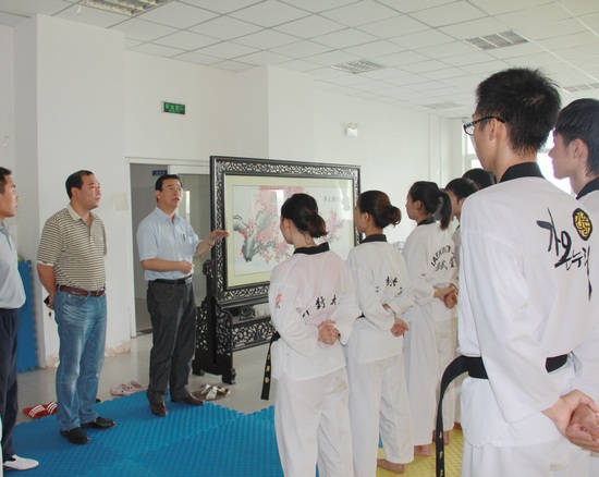 本站讯 8月28日上午,校长拜五四、党委副书记储建新到国际教育学院五楼多功能厅看望正在备战第九届全国大学生运动会的跆拳道集训队员。我省从省内高校选派16名队员集中在我校参加集训,他们将代表河南省高校参加全国大学生运动会跆拳道竞技和品势两个大项的角逐,其中我校王少丹、李丽芳两位同学作为品势项目的主力队员为冲击奖牌而刻苦训练。