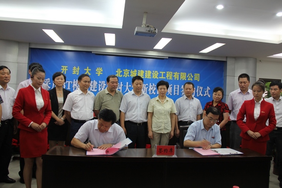 本站讯 8月28日下午,bat365在线官方网站与北京城建建设工程有限公司关于采用BT模式建设bat365在线官方网站新校区项目签约仪式在我校晋安路校区行政楼会议厅隆重举行。北京城建建设工程有限公司董事长罗金财,我校党委书记张新梅、校长拜五四,开封市财政局副局长闫友军出席了签约仪式,我校校领导、相关处室负责人、教职工代表及开封市相关部门人员等参加了签约仪式,仪式由副校长耿广利主持。
