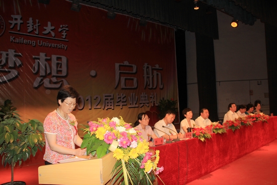 校党委书记张新梅发表讲话,祝贺2012届毕业生圆满完成大学学业,踏上新的人生征程,向悉心教导同学们健康成长的老师们表示衷心的感谢!向为同学们倾注了全部心血的父母亲人致以崇高的敬意!张书记向即将走上社会的毕业生提出三点希望:第一,希望每一位同学们坚持理想和信念,成为有理想信念和远大抱负的优秀青年,成为实现中华民族伟大复兴的栋梁;第二,希望同学们树立终身学习的观念,跟上时代步伐,养成终身学习的习惯,不断学习新知识、新技能,全面提升自己,做时代强者;第三,希望大家做一个高尚的、有道德的人,踏实做人做事,诚实守信,为社会发展做贡献。
