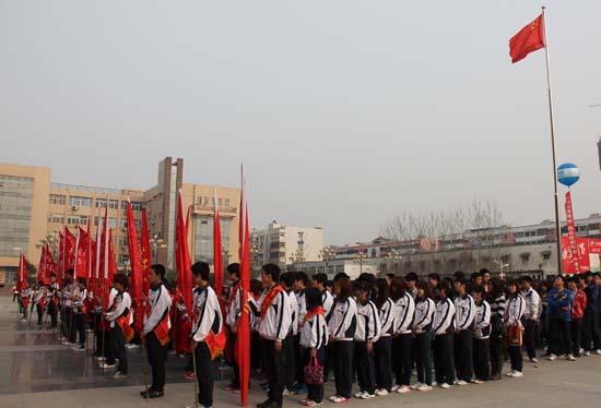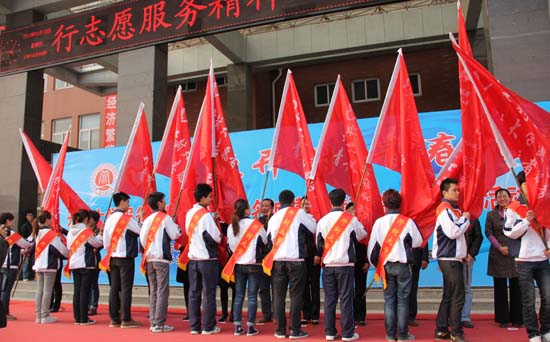 与会领导向志愿者代表授青年志愿者服务队队旗。随后,陶书记对我校开展“旅游志愿服务”活动给予个高度赞誉并提出了殷切的希望,储书记对活动的开展提出了具体要求。青年志愿者代表宣读了倡议书,倡议广大青年志愿者“践行志愿服务精神 服务开封经济发展”。