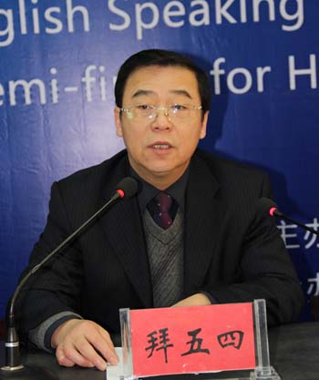 大赛开幕式上,河南省高校外语教学委员会委员、专科大学英语分会会长万鹏杰代表大赛组委会对我校领导及相关部门提供的帮助和支持表示感谢,希望各高职高专院校以本次比赛为契机,进一步提高学生的英语交际能力和综合素质,使我省专科英语教学整体水平再上台阶。我校校长拜五四、副校长赵辉出席大赛开幕式,拜校长代表学校对各位专家及兄弟院校师生的到来表示热烈欢迎,并预祝大赛取得圆满成功。