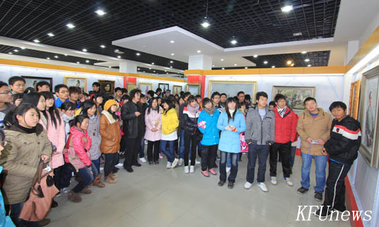 本站讯 以“情系家乡”为主题的蔚国银油画展第二十六站巡展在我校开展,展出作品82幅,每天来参观的师生络绎不绝,在全校师生中引起了强烈反响。