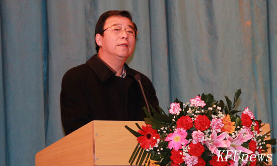 储建新宣读了李金松先生发来的贺信。李金松先生对获得金松奖学金的同学表示祝贺,在贺信中说:“在过去的一年里,你们在开大校领导和老师们的带领下,刻苦学习,奋发向上,勇攀高峰,在各个方面都取得了突出的成绩,成为全校同学们学习的榜样。开大不断创新,不断前进的精神在你们的身上得以深刻体现。我希望‘金松奖学金’能激励你们再接再厉,成为你们继续奋进的强大动力,在知识的海洋里搏击翱翔,用真诚的努力谱写一曲绚丽多彩的青春之歌,将来做一个服务社会、报效国家和人民的有用之才。”