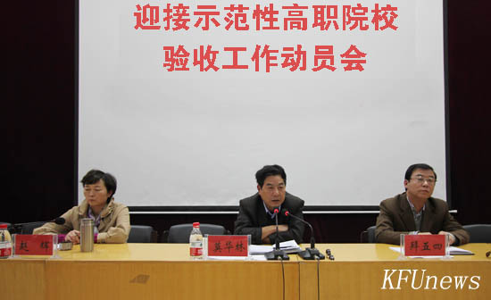 本站讯 10月27日下午, 为顺利完成省级示范性高职院校建设的各项建设任务,迎接省教育厅组织的示范性高职院校建设项目验收工作,我校在晋安路校区报告厅召开迎接省级示范性高职院校建设验收工作动员会。大会由校党委书记莫华林主持,校长拜五四及全体在校校领导和全校教职员工出席会议。
