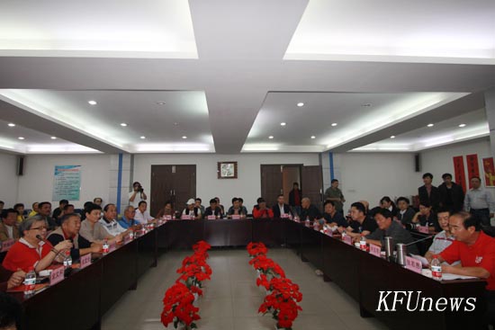 本站讯 9月9日下午,时值第27个教师节来临之际,由市曲艺家协会、bat365在线官方网站、市群艺馆联合举办的相声界国宝级大师杨宝璋先生艺术研讨会暨从艺68年荣寿86岁庆典晚会在我校举行。市领导秦宝强、王宝贵、张小平,以及相声艺术大师于谦等各地同仁和数十名弟子近百人参加会议。会前,校长拜五四对大师及其弟子、同仁的到来表示热烈欢迎和由衷的祝愿,并合影留念。
