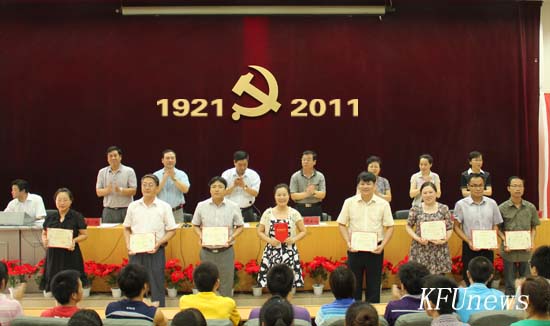 会上,校党委副书记储建新宣读了学校党委《关于表彰2010年度先进基层党组织、优秀党务工作者、优秀共产党员的决定》和《关于表彰学校基层党建工作评估获奖单位的决定》,并通报了受到省委高校工委、教育厅党组表彰的我校先进集体和优秀个人。与会领导为获奖的先进集体和优秀个人颁发了荣誉奖牌、荣誉证书。纪委书记范金梅宣读了2011年度新发展党员名单。新党员进行了宣誓,老党员重温了入党誓词;管理科学学院学生彭一帆代表新党员发言,向党组织表达了心愿和决心。