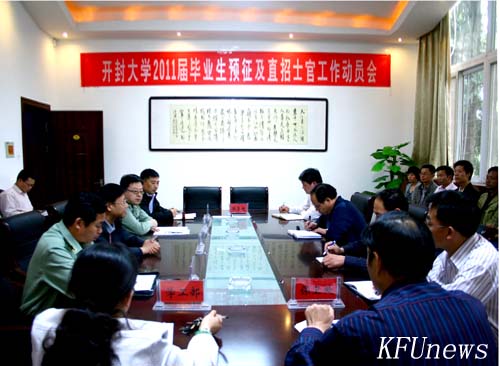 本站讯 5月13日下午,我校在就业办会议室举行2011届毕业生预征及直招士官工作动员会,贯彻落实 “四项工作”部署会议精神,动员和部署我校2011届毕业生入伍预征及直招士官工作。副校长万是明、开封市军分区军务动员科科长马明、金明区武装部副部长徐功义,学工部、教务处、保卫处等部门负责人及各院部党总支副书记和辅导员参加会议。会议由就业指导中心主任张涛主持。