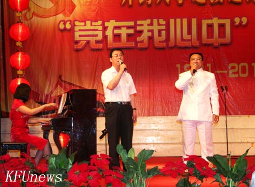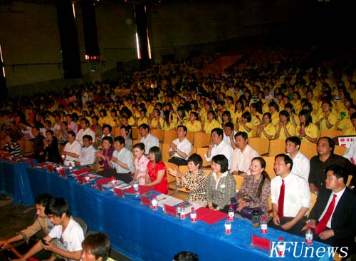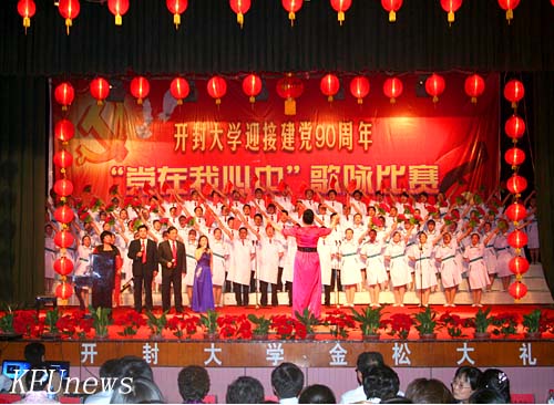 本站讯 在举国上下喜迎中国共产党建党九十周年之际,5月26日,我校组织全校师生在金松大礼堂举行迎接建党九十周年“党在我心中”歌咏比赛。校领导班子也在表演唱队列里和师生共同庆祝这一光辉的纪念日。市委宣传部副部长张小平、市总工会文教卫委员会主任李汴军及中国移动公司开封分公司的领导史洪波、尹战胜出席并观看了演出。校党委副书记储建新代表学校党委行政致词。师生们用嘹亮的歌声唱出了心中对党、对祖国的崇敬及对美好生活的向往,也唱出了乐观向上的精神面貌。