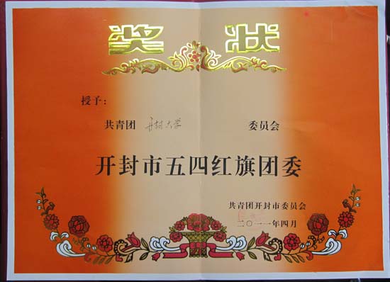 本站讯 4月28日下午,从开封市各界青年纪念“五四”运动92周年表彰会上获悉,我校被共青团开封市委员会授予“开封市五四红旗团委”称号。
