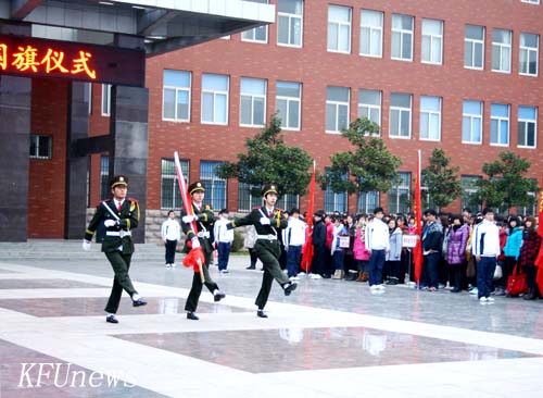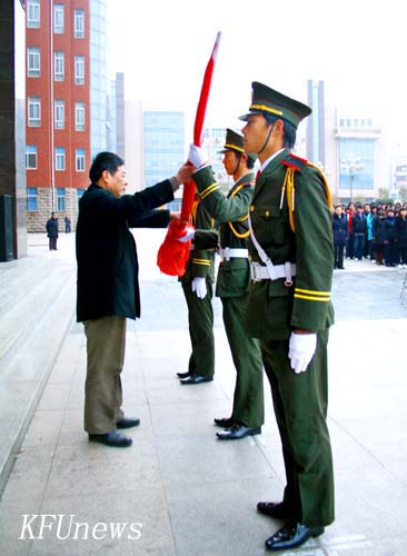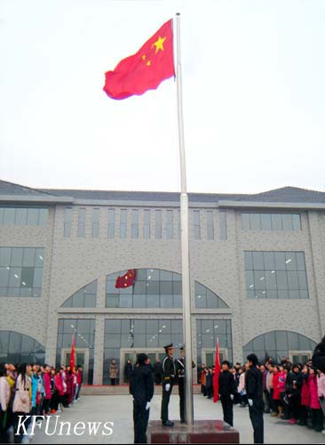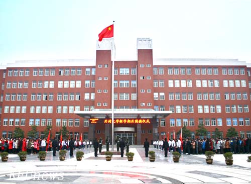 本站讯 2月28日清晨,我校在晋安路校区和东京大道校区分别举行新学期升国旗仪式。校升旗手分别从党委书记莫华林和校长拜五四手中迎过国旗,将神圣的国旗冉冉升起。全校万余名师生员工行注目礼,高唱国歌。党委副书记、副校长储建新和副校长赵辉讲话,两名学生代表分别发言。仪式分别由学工部长陈岩和校团委书记樊玉霞主持。