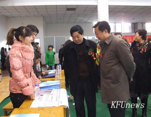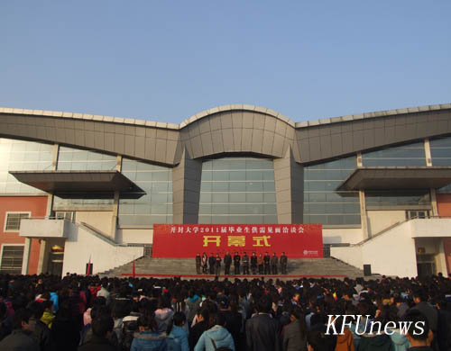 本站讯 12月4日上午,我校在晋安路校区体育馆广场举行2011届毕业生供需见面洽谈会。开封市人力资源和社会保障局局长黄玮、开封市人才交流中心主任姜慧勇、河南省九博人才网开封分公司经理王婷婷、开封博乐人才网总经理王昊,bat365在线官方网站校领导莫华林、储建新、万是明、赵辉、范金梅,党委委员、党政办公室主任成芳,企业代表奇瑞汽车河南有限公司人事科科长牛军庆、洛阳骏马化工有限公司人力资源部经理郭德民参加开幕式。党委书记莫华林宣布洽谈会开幕,党委副书记、副校长储建新做重要讲话,开幕式由副校长万是明主持。