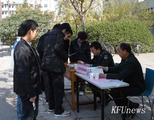 本站讯 根据开封市征兵办公室统一要求,我校大学生冬季征兵工作全面展开。11月2日至4日,开封市金明区武装部派专人在我校晋安路校区进行大学生征兵工作现场咨询,解释政策,回答学生提出的问题。我校学生积极性很高,报名踊跃,截止11月4日已有30多名学生报名参军。