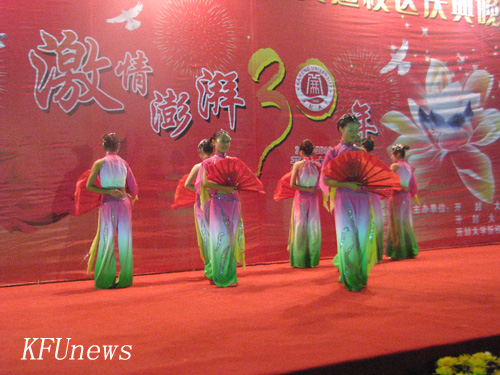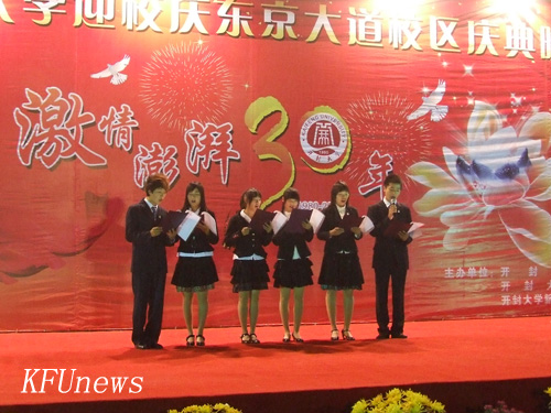 喜庆的舞蹈《开门红》拉开了晚会的序幕。一首《启程》,热情澎湃,激起了全场观众的热烈掌声;诗朗诵《三十年章回》让师生一起深情地追溯开大三十年发展的风雨历程。优美的歌声、绚丽的灯光、强劲的的舞蹈将这场晚会不断推向高潮。