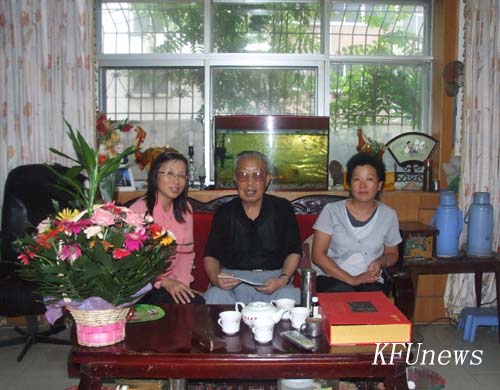 本站讯 8月20日下午,校党委组织部长、离退处处长秦雪峰、副处长孙伟到离休老干部张中杰家慰问,并带去了学校的祝福。张老是我校1980年建校时的元老,建校之初的两个负责人之一,第一任副校长,今年已86岁高龄,每天坚持锻炼身体,精神矍铄,和蔼可亲。他一直都关注着学校的发展,特别是我校30年校庆,他一拿到秦部长等带去的我校30年大事记初稿,就坐下来一字一字地认真校对初稿的建校初5年大事记,一边校对一边回忆学校创业时的感人故事。前5年的大事记,张老整整校对了一个下午,那认真劲不减当年。校对结束后,张老又给学校提供了他珍藏的很多宝贵校史资料。