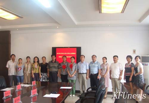 莫书记、拜校长亲自为我校西部志愿计划录用学生带上光荣的大红花,并与她们合影。随后,校领导分别讲话并与志愿者亲切座谈。校领导在讲话中,首先对两位志愿者的志愿行为给予肯定,并希望她们到西部后,积极向上、努力工作、认真学习、健康生活,以实际行动展示我校大学生风采,要将个人发展与西部发展、国家政策联系在一起,为西部发展做出贡献,为母校争光。与会人员与西部志愿者亲切交谈。