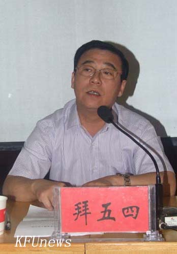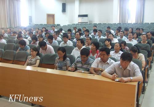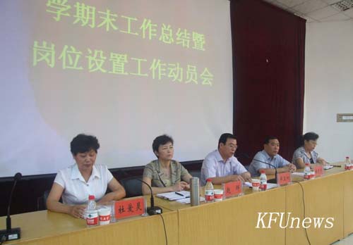 本站讯 6月28日上午,我校开学期末工作总结暨岗位设置工作动员会在报告厅召。校领导拜五四、储建新、赵辉、范金梅、杜爱灵在主席台就座,校长拜五四总结2010上半年工作,对暑期主要工作做出安排,并对我校岗位设置工作进行动员,正县级调研员杜爱灵宣读bat365在线官方网站岗位设置管理工作领导小组名单,并传达开封市岗位设置工作会议精神。全体中层正、副职干部参加会议,会议由校党委副书记、副校长储建新主持。