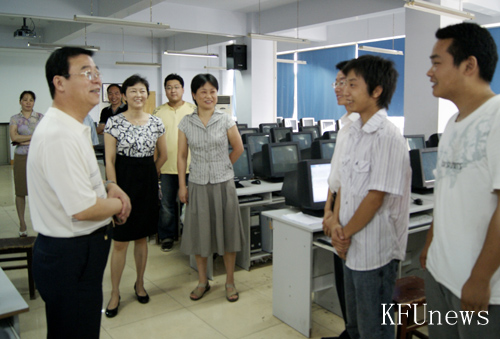 本站讯 7月6日,校长拜五四、副校长赵辉带领学校党政办公室、党委宣传部、教务处、实验实训管理处的负责人到管理科学学院电子商务实训室,亲切看望了正在紧张准备参加企业管理沙盘全国大赛的师生。