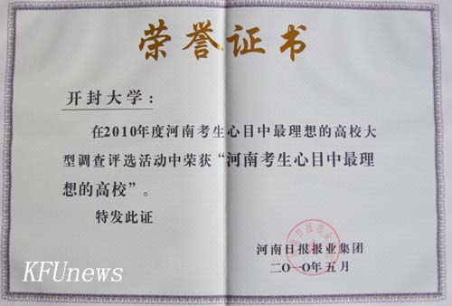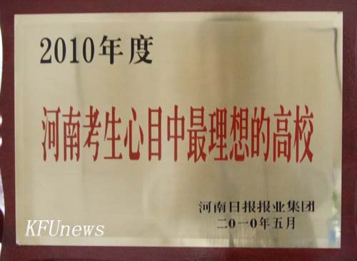 由河南日报报业集团举办的“2010年度河南考生心目中最理想的高校”大型调查评选活动从今年3月份启动以来,备受社会关注。共有300多万读者和网民参与河南日报和大河网的投票。我校党委宣传部在此项评选活动期间,积极组织全校师生参与。经过评选,我校荣获“2010年度河南考生心目中最理想的高校”荣誉称号。