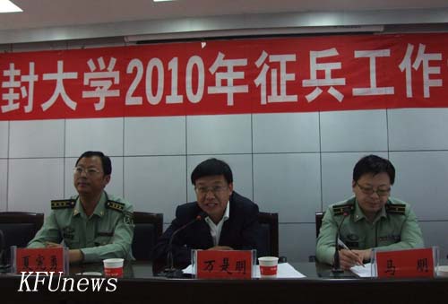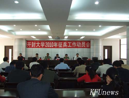 本站讯 5月15日上午,我校在会议厅召开2010年毕业生入伍预征工作动员会,贯彻落实全国普通高校毕业生入伍预征工作会议精神,动员和部署2010届毕业生入伍预征工作。副校长万是明、开封市军分区参谋马明、金明区武装部部长夏宪勇,教务处、学生处、保卫处等部门负责人及各院部领导和辅导员参加会议。会议由就业指导中心主任张涛主持。