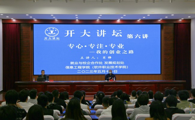本站讯  5月11日下午,“开大讲坛”系列报告第六讲在行政楼第一会议厅举行,优秀校友、信息工程学院毕业生肖锋应邀做题为“专心·专注·专业我的创业之路”的报告。就业与校企合作处、信息工程学院(软件职业技术学院)等部门230余名师生聆听了报告。讲座由信息工程学院(软件职业技术学院)院长张新成主持。