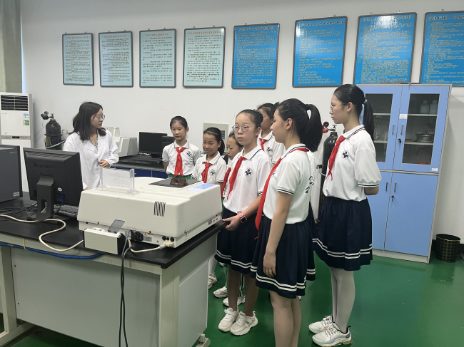 为丰富活动内容,提高学生学习兴趣,材料与化学工程学院针对参观学生年龄特点制定了集学习、观摩、操作于一体的活动内容。杨磊代表学院对到来的同学们表示欢迎,并对学院的概况和本次活动的内容和注意事项进行了介绍。王新颖带领同学们参观了分析测试中心,介绍了热分析仪、气相色谱仪,液相色谱仪,激光粒度分析仪等仪器,讲解了相关的原理和应用。