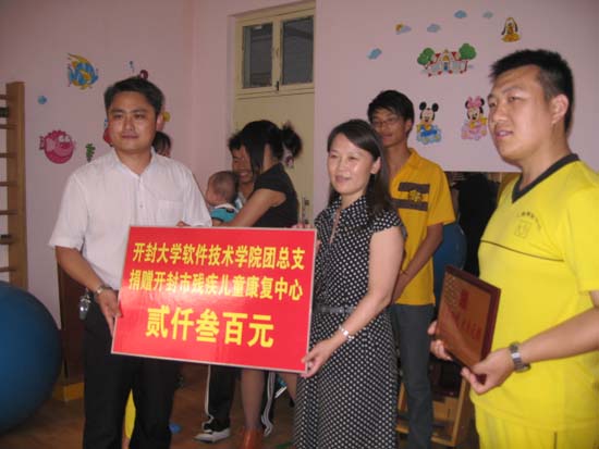 六一国际儿童节也是残疾儿童康复中心的小朋友们的集体生日,当日下午,学院团总支书记田俊松带领3名学生干部代表学院全体师生,来到开封市残疾儿童康复中心,将2300元现金送到了中心王睿莉主任手中。