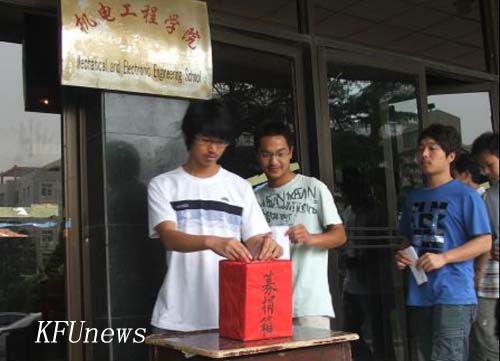 本站讯 一号教学楼前,机电工程学院全体师生冒着沥沥细雨,主动为机电学院栗洪照老师捐款,筹集医疗费。