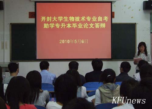 化学工程学院生化教研室主任韩艳霞担任本次答辩委员会主任,她首先代表学院对出席本次答辩会的各位领导和专家表示热烈欢迎,并详细说明了本次自考助学专升本答辩时间安排、学生分组、评分标准及答辩注意事项等。参加当天答辩的2008级四位专升本同学准备充分,思路敏捷,专业知识扎实。她们首先对自己所作的本科论文进行了15分钟的陈述,之后就答辩老师所提的问题作了一一回答。答辩会后,孟喜乐教授对我校参加论文答辩的同学们的表现给予了很高的评价,并鼓励他们本科毕业后刻苦专研,继续努力提升学历层次,。
