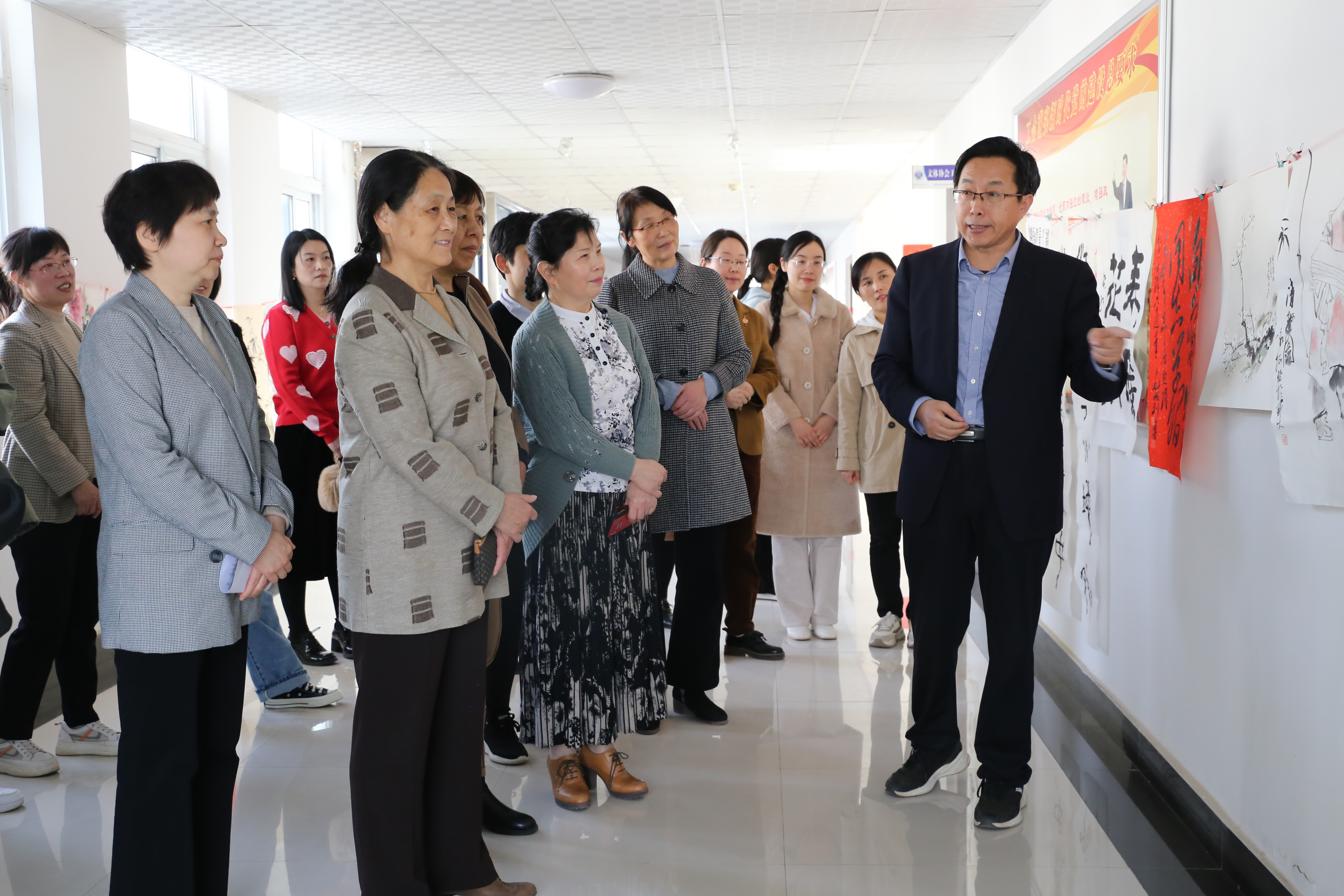 为庆祝第113个“三八”国际劳动妇女节,弘扬中华民族优秀传统文化,3月8日下午,bat365在线官方网站在行政楼教职工书画活动室举办庆“三八”国际劳动妇女节书画笔会活动。活动邀请了开封市女书画家协会主席吴士娟、开封市女书画家协会副主席袁菊英、开封市女书画家协会副秘书长尚舒娅三位女艺术家。校党委书记陈灿,校党委委员、工会主席成芳出席活动,校女教职工书画爱好者及部分学生书画爱好者二十余人参加了此次活动。